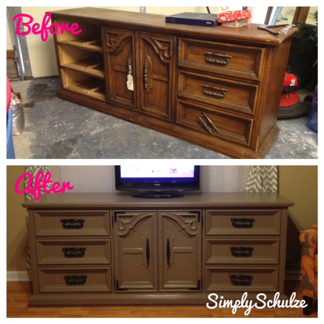 My next wooden redo (and the mother of all projects) was a super long dresser that I repurposed as an entertainment stand/center for our living room. This is probably my favorite redo yet. Given what it looked like to begin with this came out amazing and I am so proud of it! I spent quite some time looking for a piece that would work as our living room entertainment center, everything I was finding was too small and the ones that did fit my size requirement were too pricey. I finally located a long ornate looking dresser at one of our local thrift shops and knew it would be perfect, especially for the price – it was only $85.00! Yet again, I am sad to say that I do not have step-by-step pictures of these projects but I will do my best to explain in detail, check out my pics below for before and after images of all three projects. Here’s how I did it: