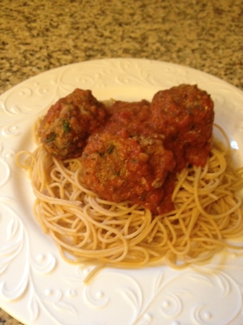 - Serve up with your favorite sauce and enjoy! I served mine with whole wheat spaghetti and homemade tomato sauce, but since they have rice as a filler they would also be great as a meal without pasta but I love to pile on the carbs 🙂
