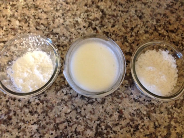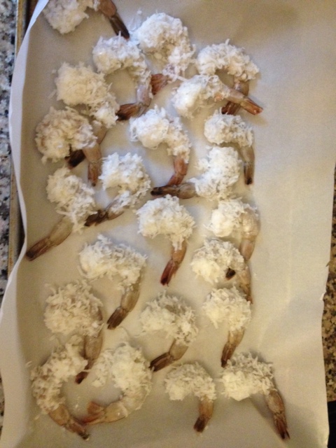 - Line a baking sheet with parchment paper. Next take each of your shrimp, dip them in the cornstarch, then the egg whites and coconut and place on baking sheet.