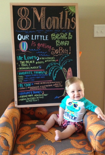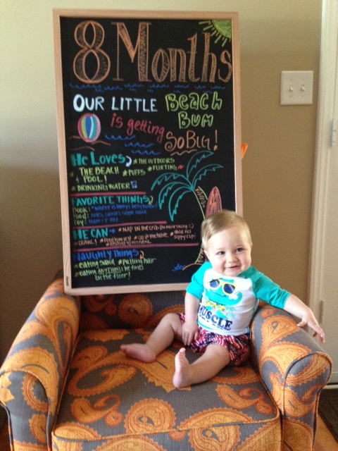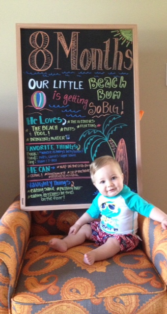 These last two weeks have been CRAY-ZY and have left me absent from blogland as I scramble to try to get us all set up to move into our new home TOMORROW! I promise to get back to it once we’re settled (hopefully with some great new posts on how to spruce up these cookie cutter military homes!). Over the weekend my sweet baby P turned eight months old and I did find the time to eek out a cute little beach themed summer chalkboard. I must say that these last two months with baby P have been my favorite, he is crawling and eating by himself and learning new things everyday. He is SO much fun and really loves spending time with J and I, each day I feel more and more like he is a real active part of our little fam now (as opposed to a little prince on a pillow lol). Here he is in all his eight month glory right before we headed down to the beach on Sunday for one last day of relaxation before this crazy week! Check out baby P at month seven and his other chalkboards here!