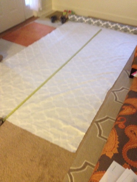 Step 1: Anytime you order a large quantity of decorator fabric it will usually come rolled on a giant cardboard cylinder (kind of like a giant toilet paper roll, lol). So I began by rolling out my fabric and measuring out the necessary length, which for me was 91″ with three additional inches added to accommodate a one inch hem at the bottom and a two inch fold-over at the top to create a pocket for the curtain rod (the size of your pocket will depend on the girth of your curtain rod, make sure you measure accordingly), for a total of 94″ per panel. After measuring my 94″ length I cut five 94″ pieces, as I was going to be making five panels.