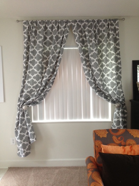 These particular curtains were born out of my love for Pottery Barn’s “Kendra Trellis Drape” which came in at $99 per panel … seriously?! Since I didn’t (and probably won’t ever) have that kind of coin lying around to spend on curtains but nonetheless desperately needed a window covering in a fun print to distract from these hospital-white base housing walls, I came back to my trusty DIY curtain project once more. For these particular curtains I chose a grey and white trellis pattern (similar to the one on the overpriced PB curtains), to compliment our grey and orange furniture (see below for details and pricing). It took me about 20 minutes per panel to create these pocket curtain panels, so I would just work on them at night while my hubby and I caught up on our shows, this way I could be certain that any tiny fingers would keep out of the way :). Now that the curtains are hung I am thrilled with the outcome, and while I know I could have very easily gotten some cheap Walmart or Target brand panels for a comparable price I like that I was able to pick from literally thousands of fabric patterns to find exactly what worked for me … and of course that I was able to make a project out of them :). As I do, when you see an interior decorating or design piece in a store that is either outside of your budget or just not quite what you’re looking for always try to get creative and think of a way you can DIY it, chances are you’ll pleasantly surprise yourself!