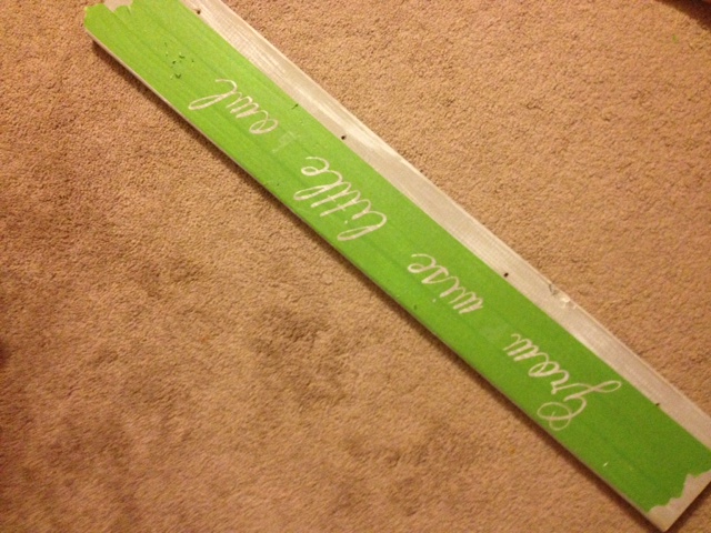 Step 4: I then prepared to paint my wording onto the board. I covered the entire area over which I wanted my saying to cover with painter’s tape (make sure the tape is touching but overlapping as little as possible, as it will be harder to cut through certain areas if the tape is overlapped, it’s not a big deal if it overlaps but I just thought I’d mention it to make your life easier). Once my wood was covered with painters tape I arranged my wording atop the tape and covered that with scotch tape. Now you are ready to create your own little DIY stencil!