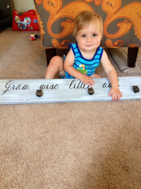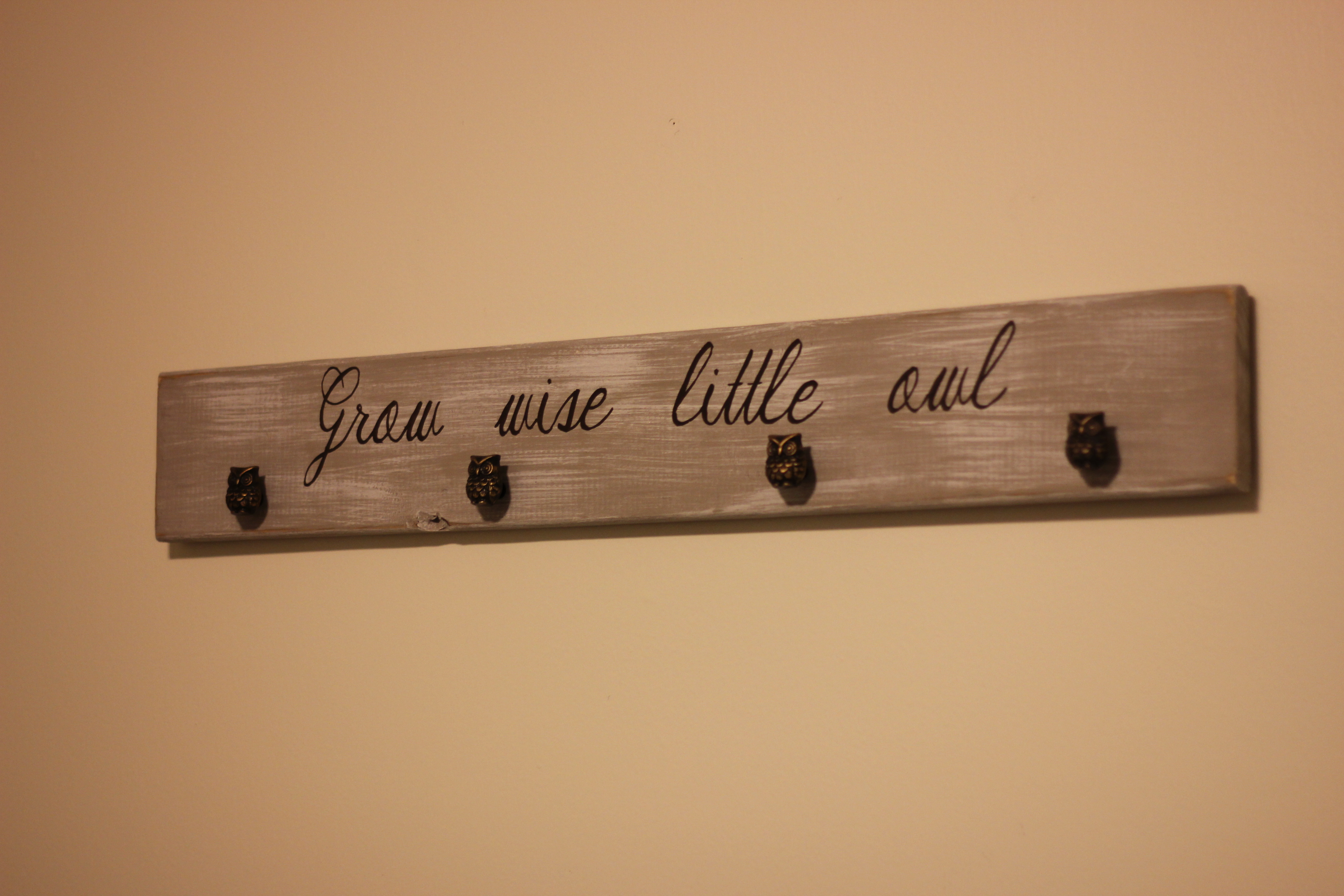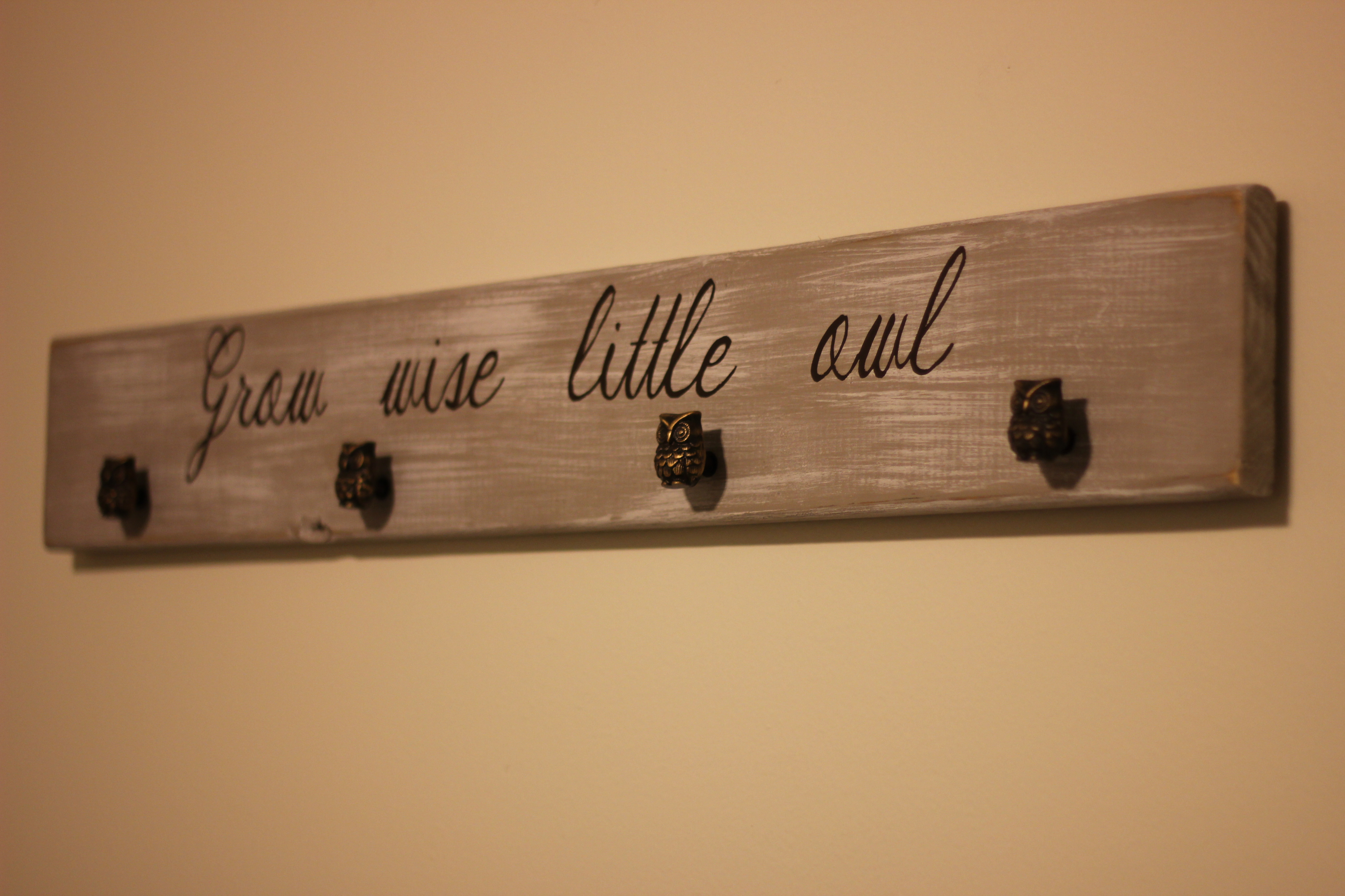 Now back to baby P’s sign – when we moved I made the hard decision (but smart for our wallets) not to re-purchase the owl-themed wall decals that we had put up in P’s old room so I figured that in lieu of the “grow wise little owl” decal I could just paint that same saying onto the sign in a similar font, making it a permanent piece of decor rather than a decal that would have to be left behind! While originally this project was just supposed to be a sign with an owl-themed saying, it took on a whole new life as a coat-rack/hook rack when I remembered that J’s sweet cousin had gifted us the cutest little owl furniture knobs when I was pregnant with P, which she figured I would probably use on one of my future furniture re-dos. Since P’s room couldn’t really fit any other furniture I all but forgot about the knobs until I had come up with the idea for this sign and had an “ah-ha!” moment and realized that these knobs would be the perfect addition to the sign not only because they were owls but because we would now have the option to use it as a baby coat rack come the fall/winter seasons and perhaps also a way to hang a few little framed pictures. So a little paint and a few drill holes later I had the most beautiful little coat rack which I’m sure my baby P will enjoy for years to come. I hope you love this idea as much as I do, this will work with any piece of scrap wood and any amount/style of hooks or knobs and you will be amazed at how easy it is to create!