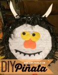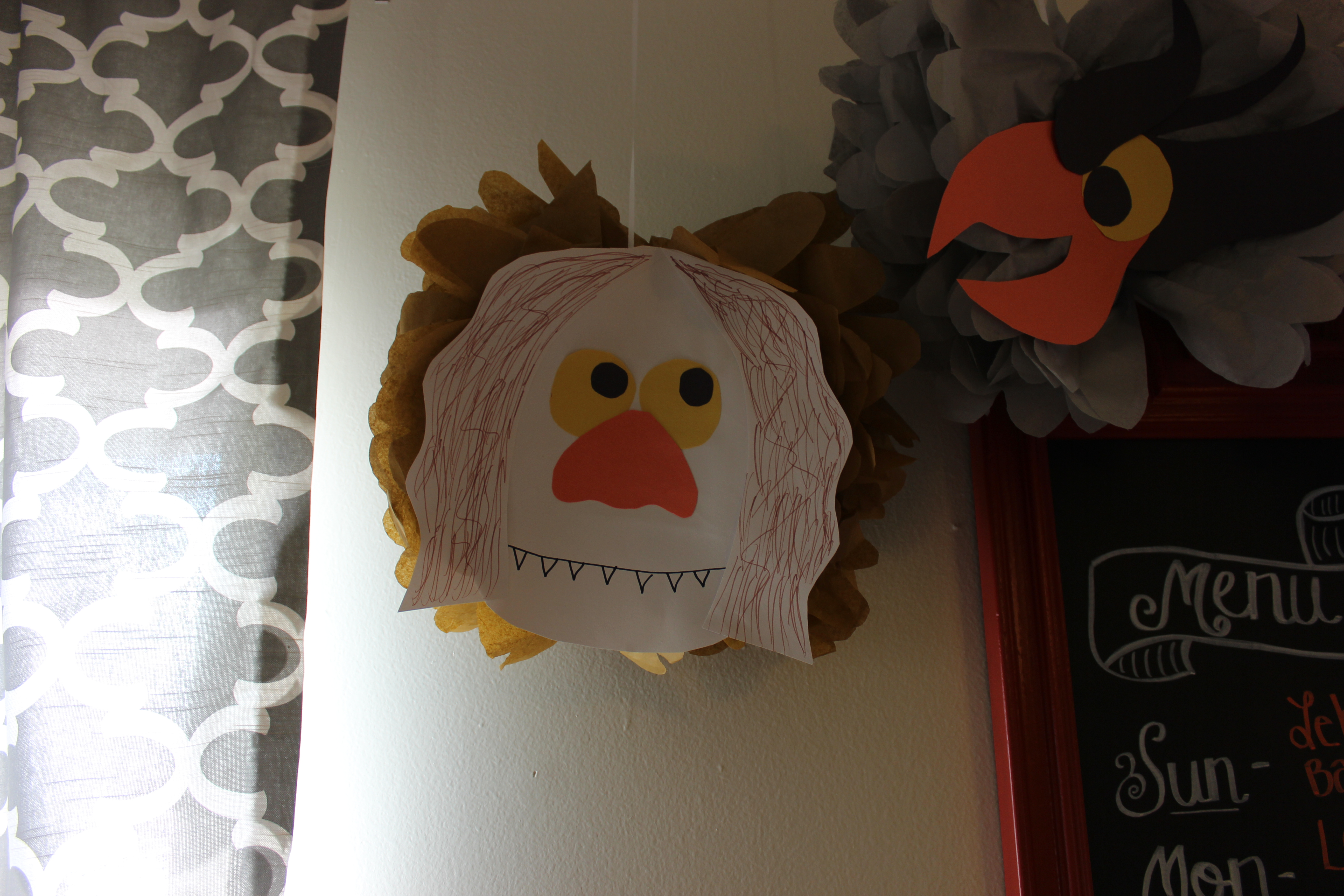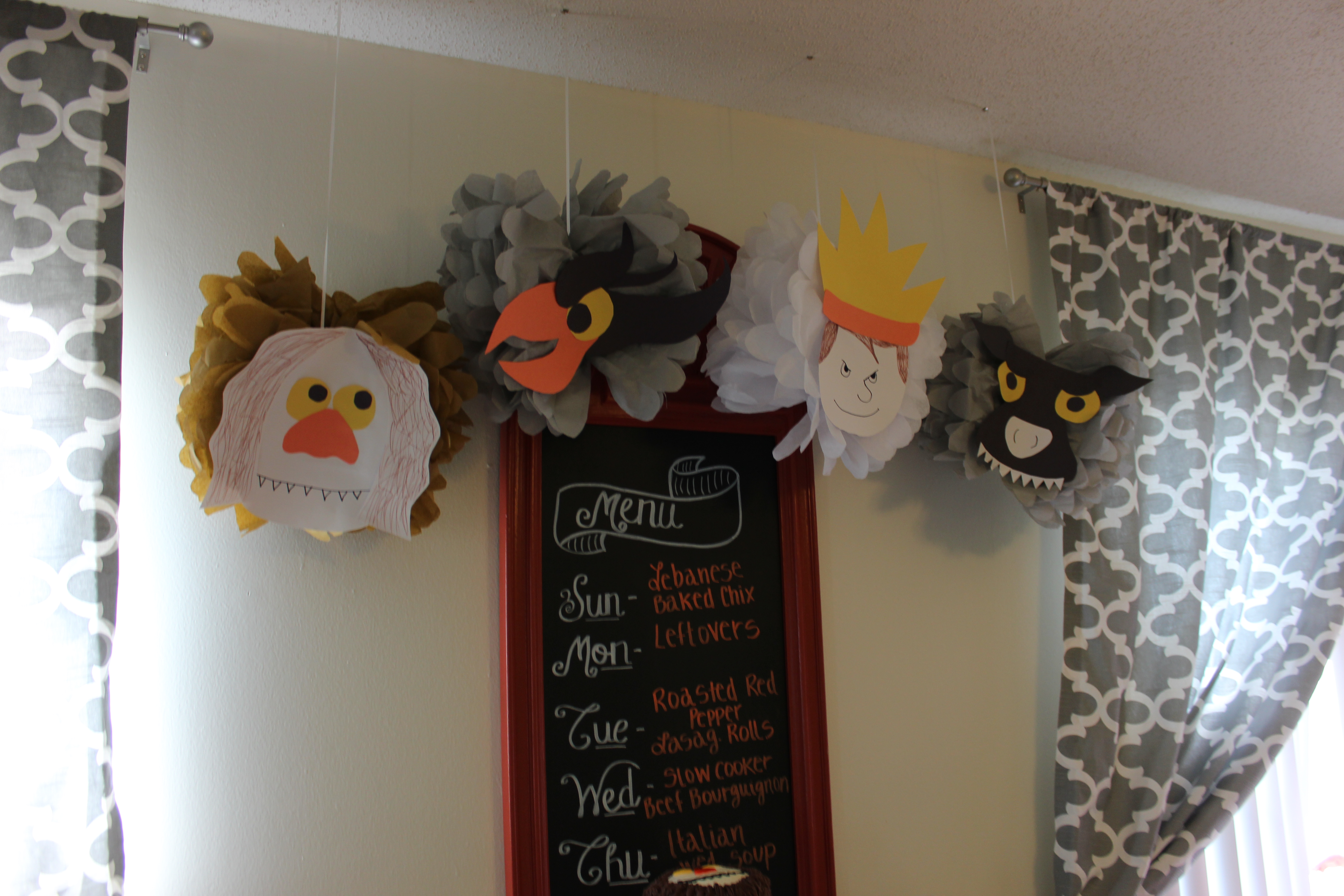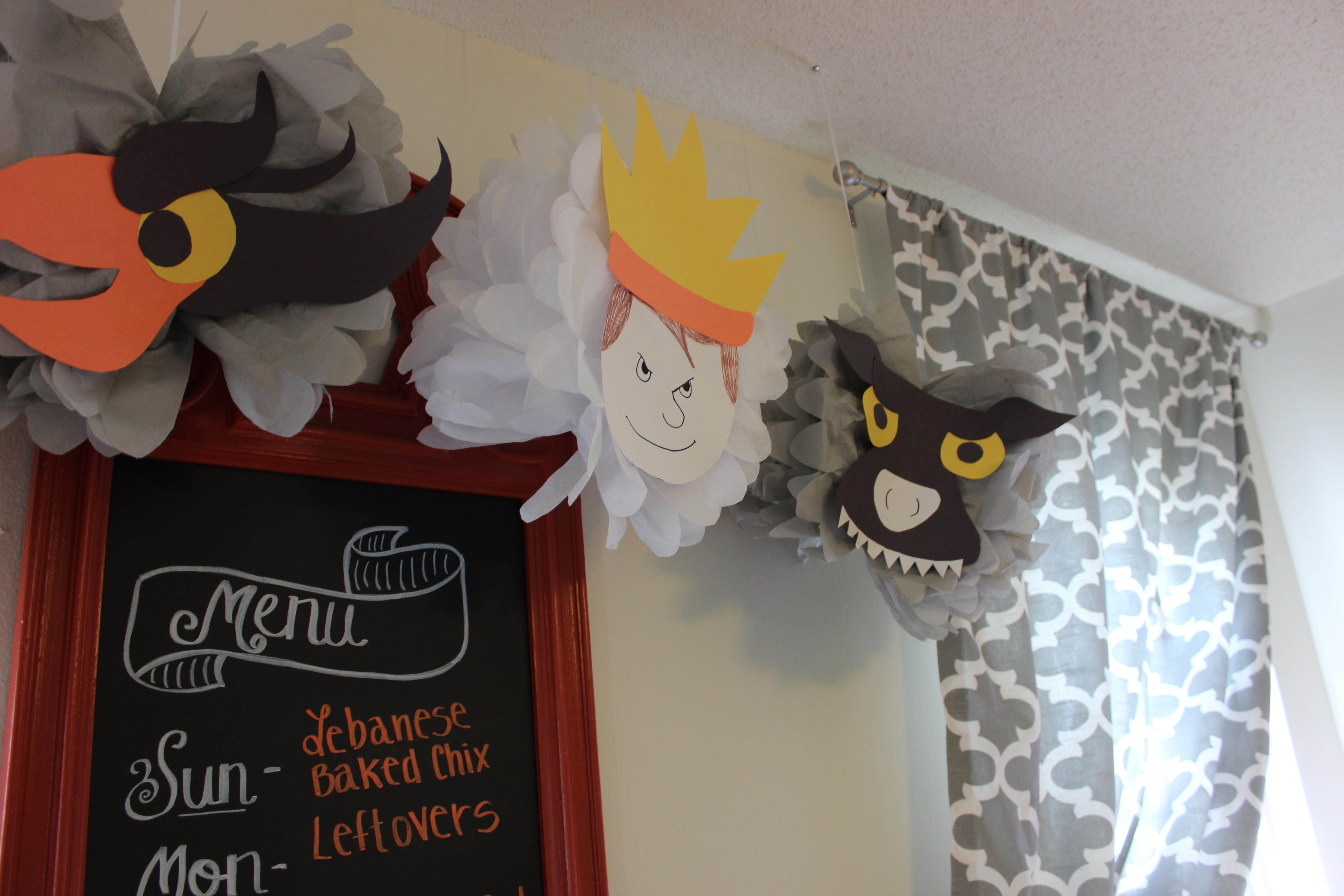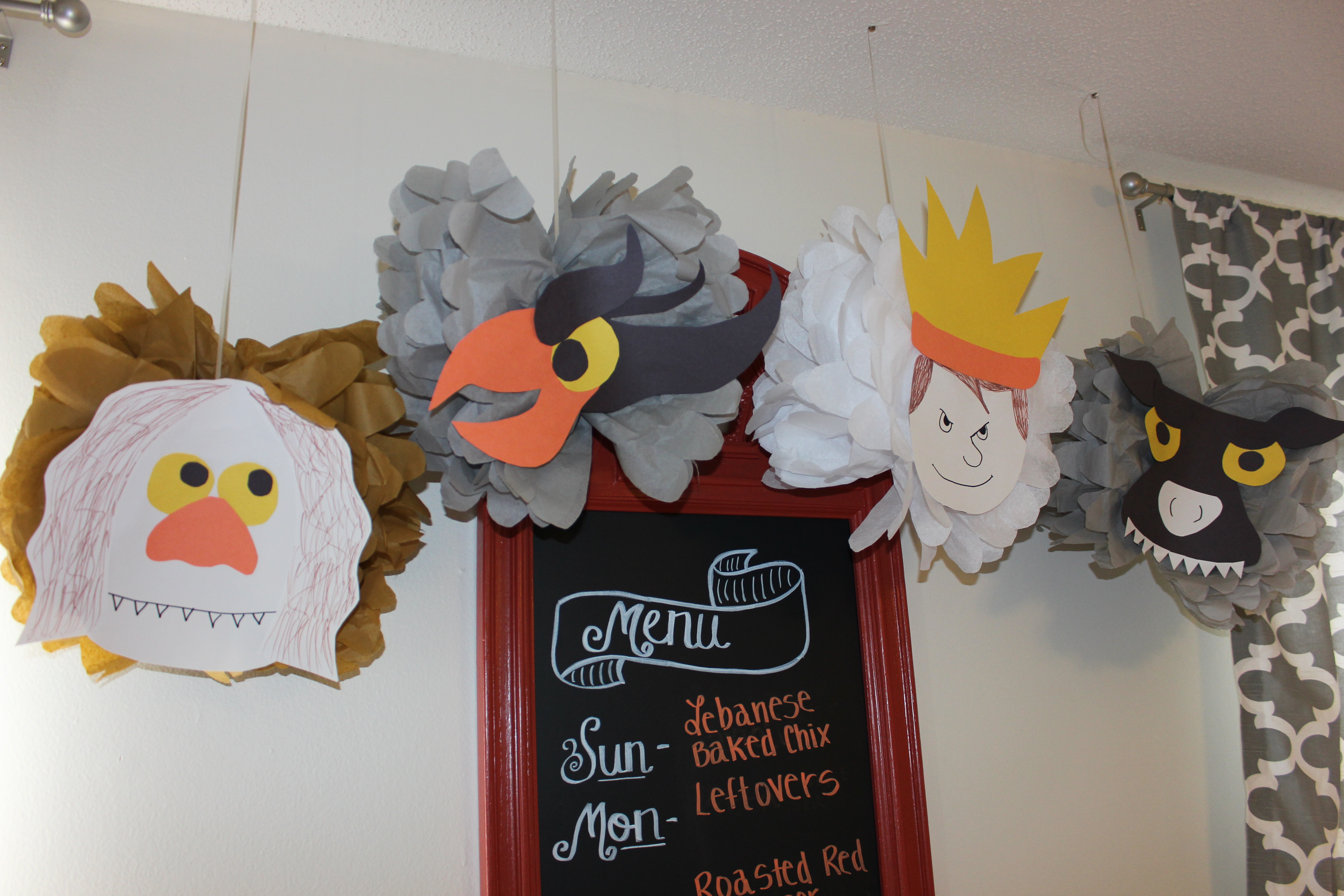 I don’t have step-by-step photos for this one because as long as you can figure out how to make the poms themselves using either YouTube or Pinterest tutorials then the rest will be pretty self explanatory, all I did was cut the various shapes for the “wild thing” faces out of construction paper and used magic markers to color in where needed. Once I assembled the faces I used Elmers glue to attach them to the front of each of the poms, allowed them to dry and that was that! This was a super easy and fun way to jazz up the party décor and I definitely see myself returning to this idea for future parties, as you can basically create a character from any pom.