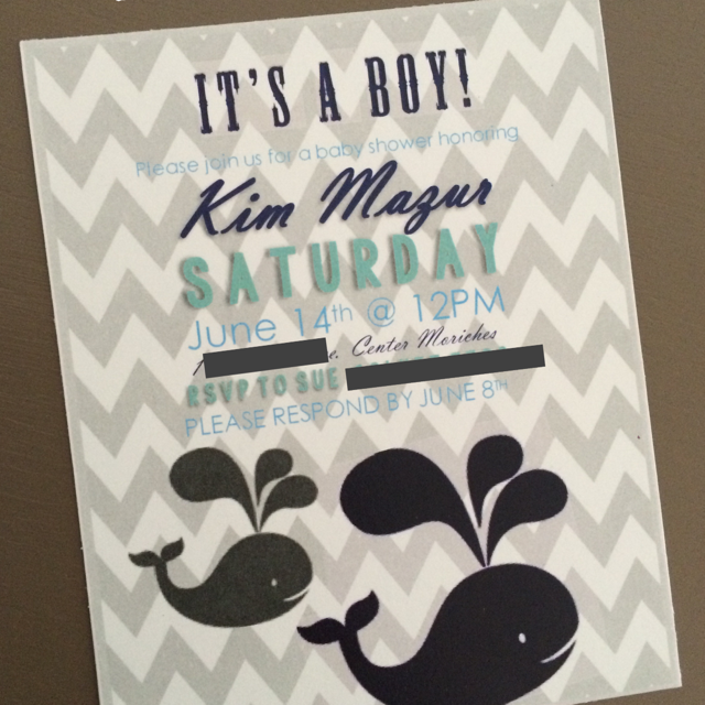 I will use my sweet friend K’s baby shower invite as an example, since it is an easy and trendy little design. This one came in at a cost of just about twenty cents per card since I did four to a page! Check out my post on the “Whale-of-a-Time” Diaper Cake I made for this shower as well. Obviously if you’re proficient in Photoshop this whole post is going to seem extremely silly to you, but if you’re not and are after a cute custom invite or card at a great price this is an easy alternative!