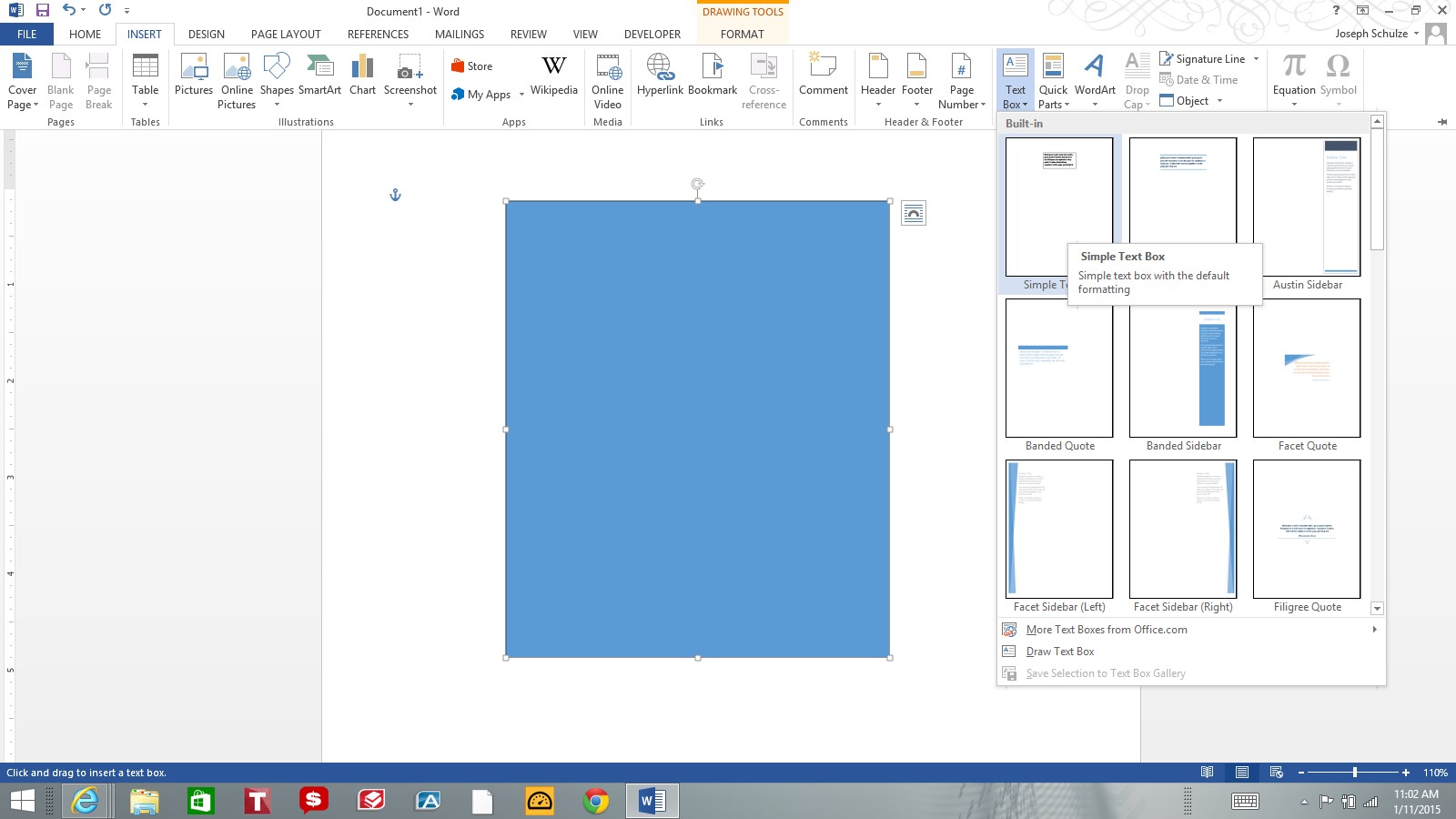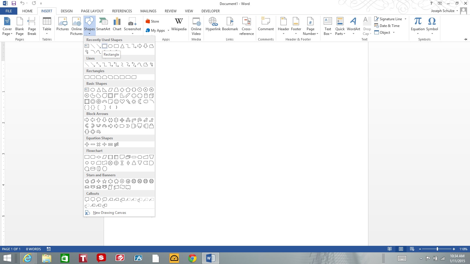 Step 3: To create the actual invite I began by opening Word and inserting an object in your desired shape. NOTE: For cutting purposes a square or rectangle works best, but if you are set on a circle just be prepared to have to cut them each individually. The size of your shape does not matter, just make it large enough for you to work with, the print store will be able to print them to whatever size you want once they receive it. Select: INSERT>SHAPES>RECTANGLE