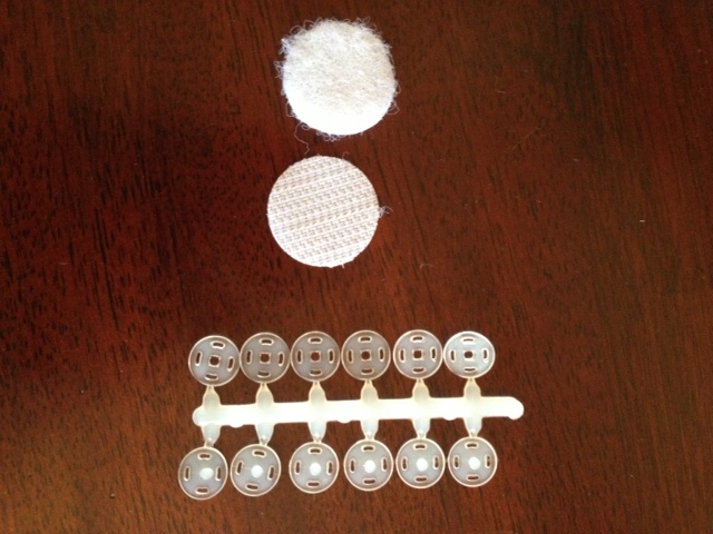 I used velcro dots but if it is cheaper to purchase velcro in a roll or larger piece you can just cut it yourself. The nylon snaps are shown as well, I chose these as opposed to metal snaps because they don’t require a special tool to attach them to fabric.
