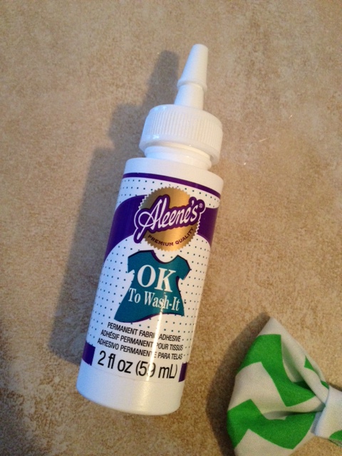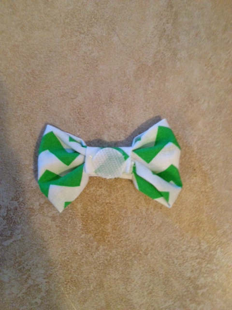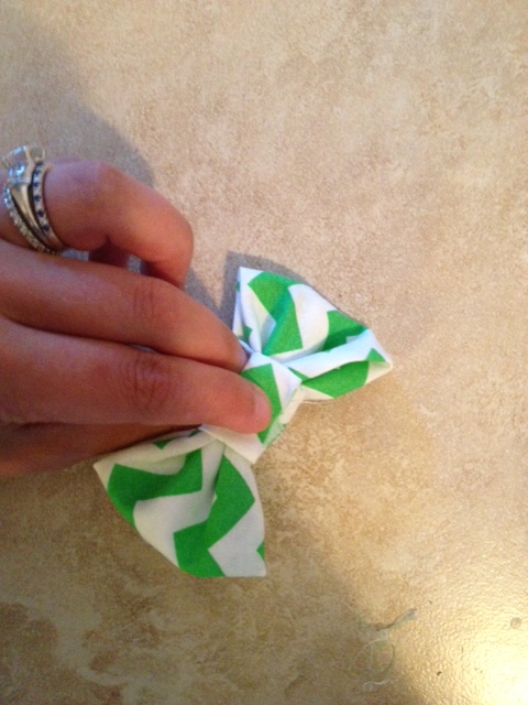 Step 1:   Use this bow tie tutorial to create as many bows as you want. I used the hot glue method and wherever it said to iron I didn’t (I’m lazy, lol) and my project still came out great. Quick note about sizing, the bow in the tutorial will be about 3.5″ across (give or take), so for an infant this would be fine on a headband but way too big on a clip. If you are looking to make a smaller bow I would change the measurements to 5X3 and 1.5X1.5 for the two fabric squares. Once I play around with this a little more I will give exact measurements and pictures but as I’ve mentioned, all my friends are having boys!