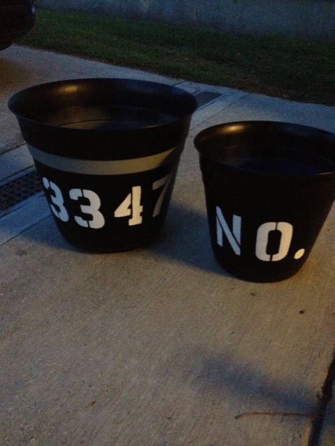 In my landscaping-on-a-budget post I discussed how we went about sprucing up our Honey Tree home with basically empty pockets, so we decided to apply the same principals here to make our new happy little home look a little more happy on the outside. I will most likely be posting about our new little landscaping project in detail but for now I wanted to share my little pièce de résistance of my outdoor decor – my painted plastic planters! These were inspired by a pair of painted terracotta pots I found on Pinterest (see picture below) and had the terracotta pots at Lowes been on sale I probably would have duplicated the project exactly, but at clearance prices of $2.99 and $1.49 and I couldn’t resist purchasing the large plastic containers that I ended up using instead. Another reason this project had me so giddy, is that since I already had spray paint on hand all that I needed besides the pots were a few plants and of course I chose perennials so that I could enjoy my little plastic wonder pots year round 🙂 This project can absolutely be done using any kind of planter, or better yet planters that are already black in color, I just chose to go with clearance items since the black ones were full price. You can even save yourself the trouble of using a store-bought stencil by checking out my hand painted sign tutorial and using the same technique for creating a stencil using painter’s tape. Hope this inspires you to do some fall landscaping while everything is going on sale! 🙂