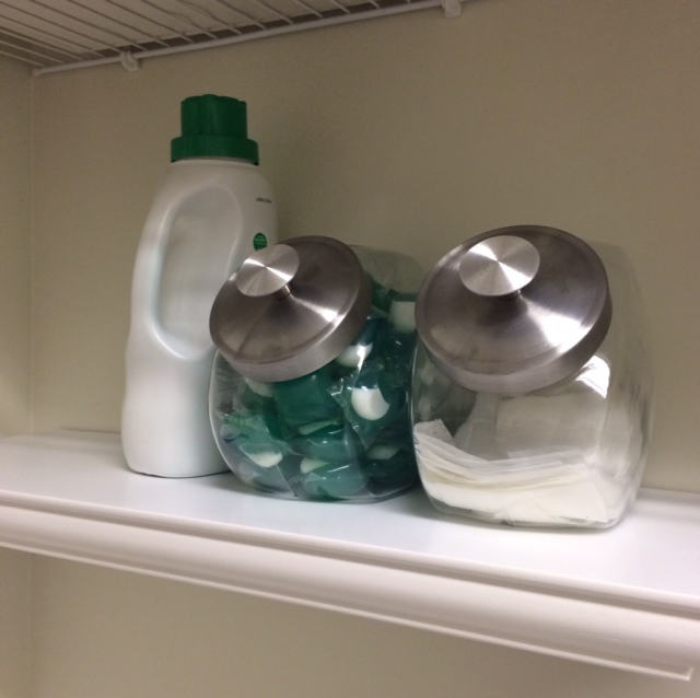 13 // Candy Jars – Used for holding detergent pods and dryer sheets. I purchased mine at Walmart for $2.98 each.