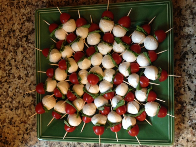 Next, I assembled my mini caprese bites by threading half a tomato (through the non-cut end first) then a folded piece of basil and finally a piece of mozarella.
